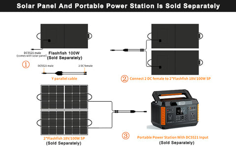- Allow to connect Flashfish 2*50W Solar Panel, 2*60W Solar Panel, 2*100W Solar Panel, 1*50W/60W+1*100W Solar Panel