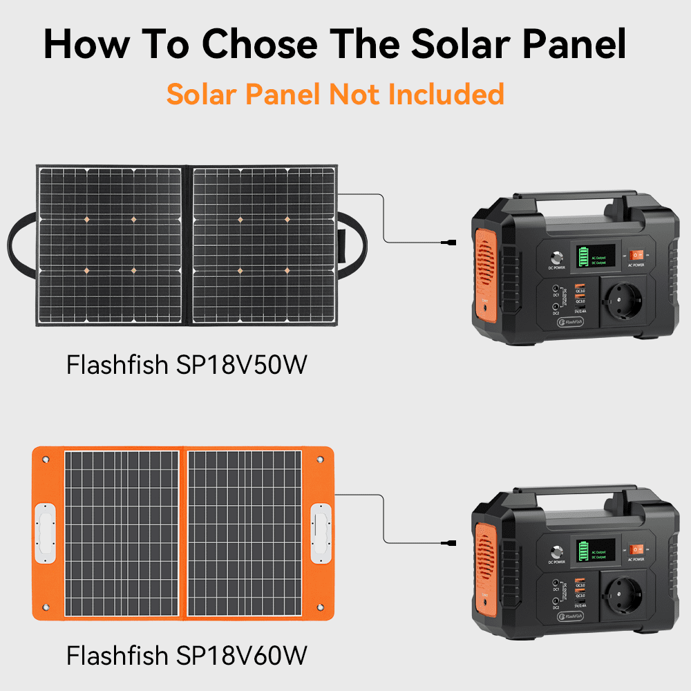 FlashFish E200 power station can be charged by the 15-24 volt solar panel (recommend 50W/60W), AC wall adapter and car charger efficiently. No memory effect, no worry about battery capacity reduction.