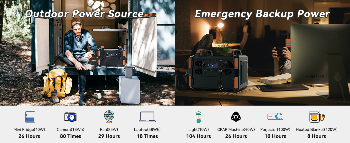 • 1000W AC Pure Sine Wave Inverter (1000W surge) with 1041.6Wh Capacity;