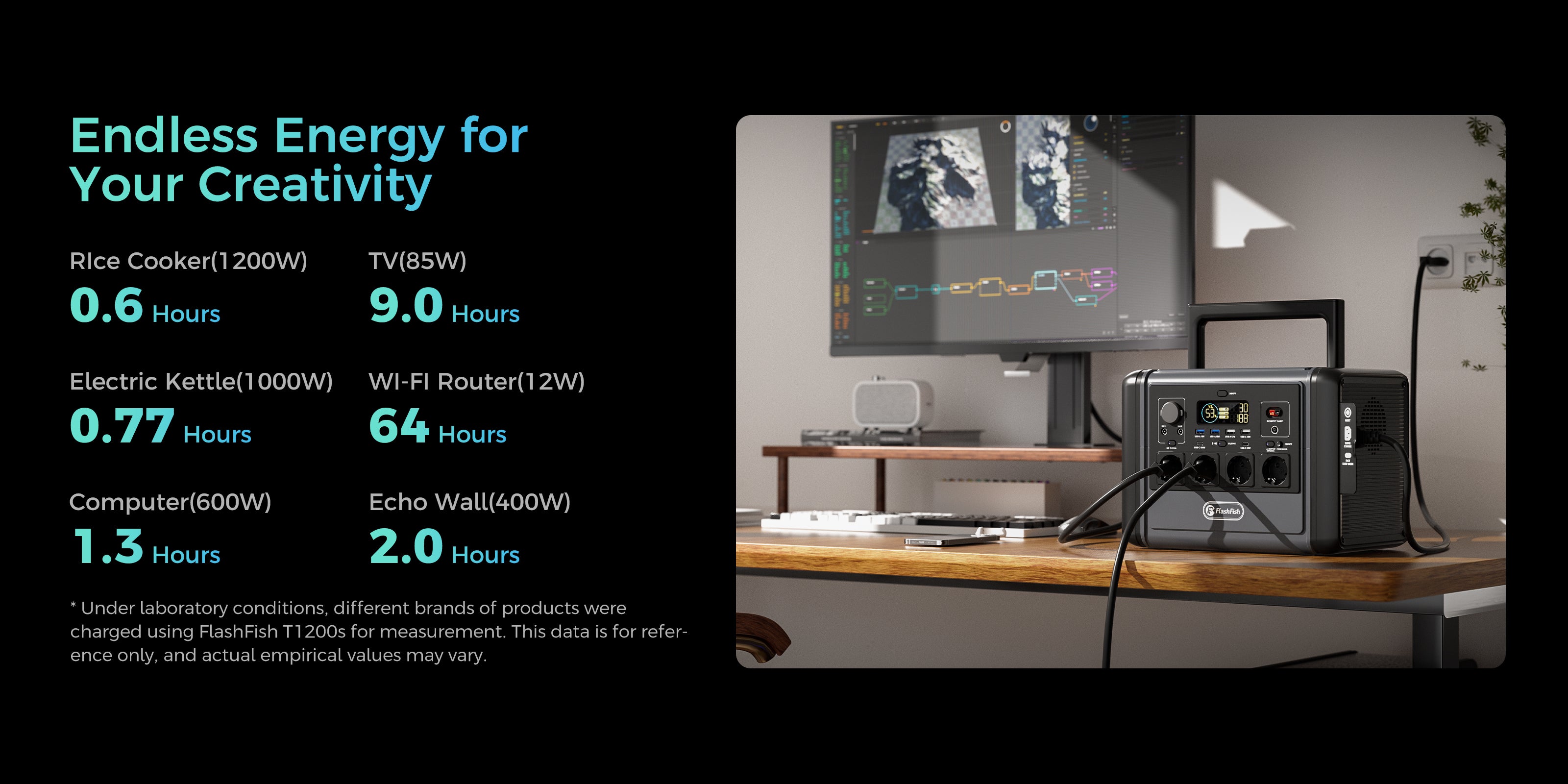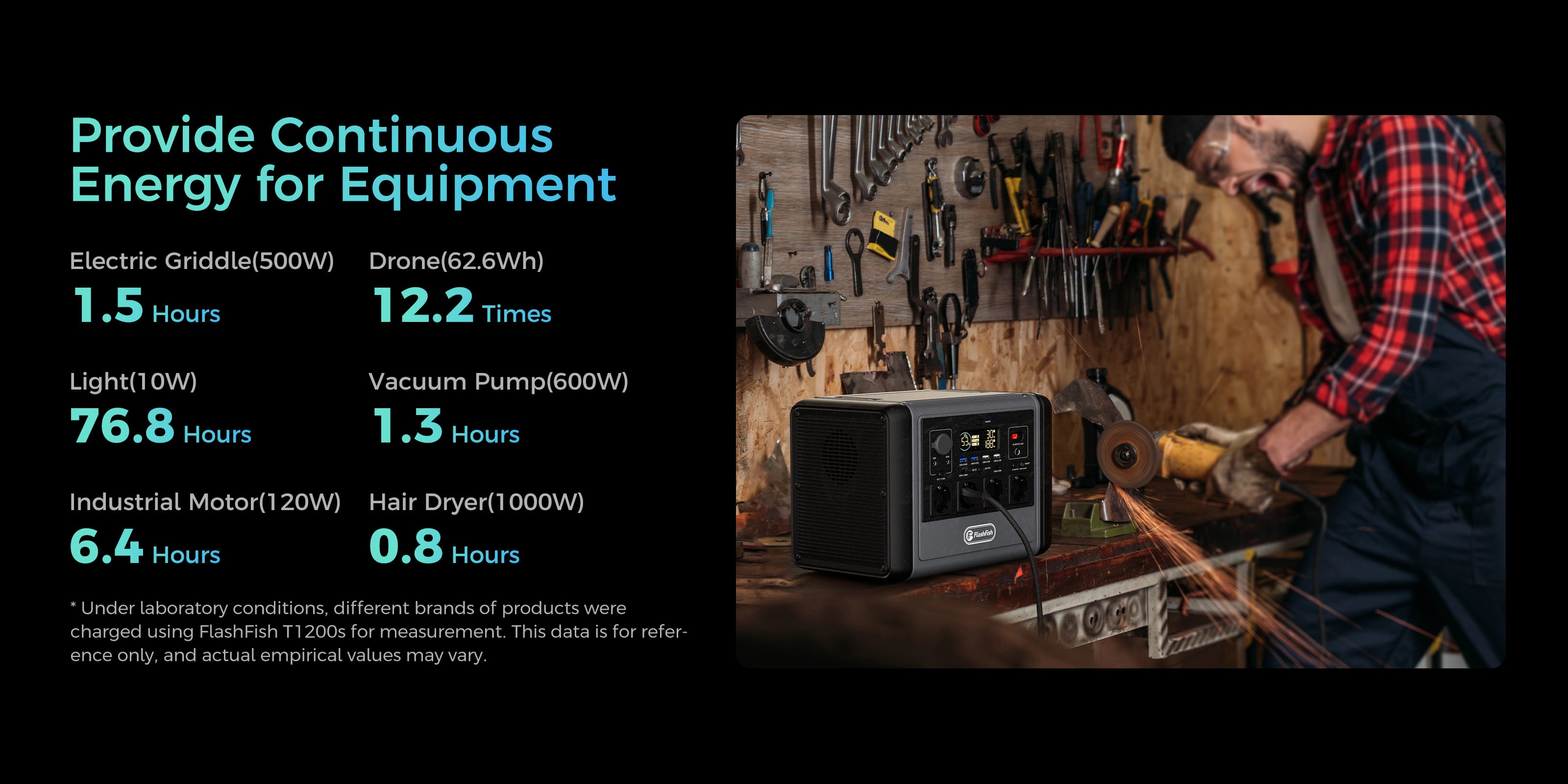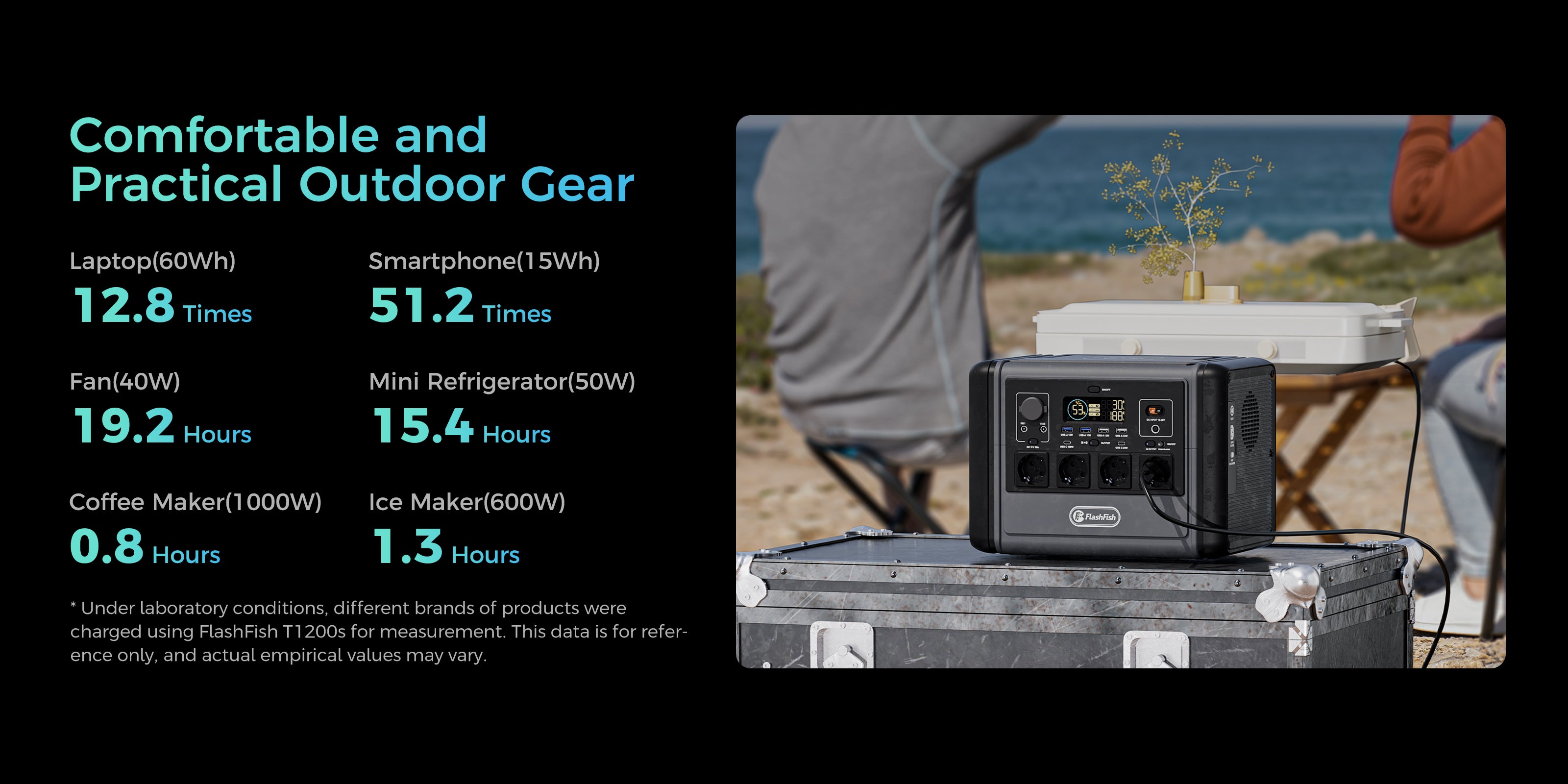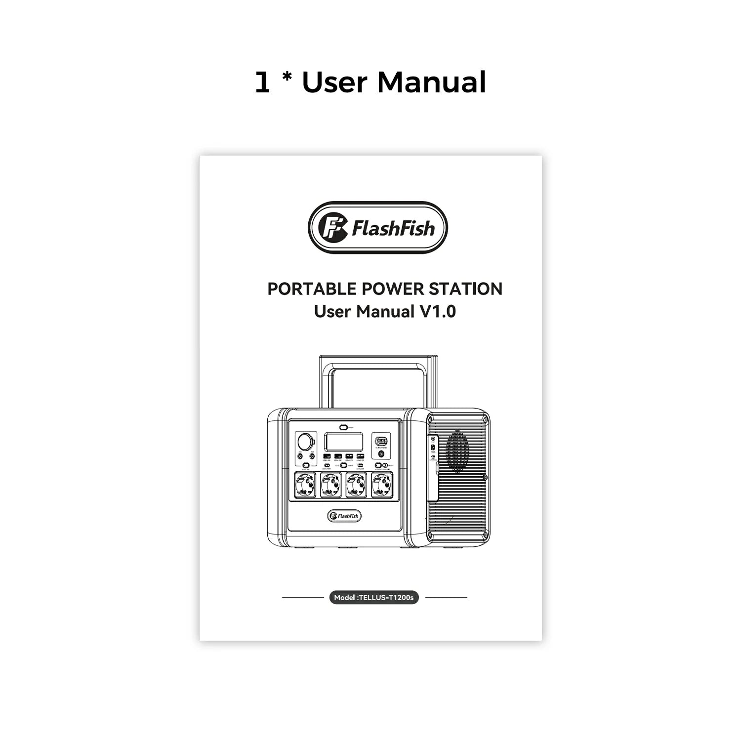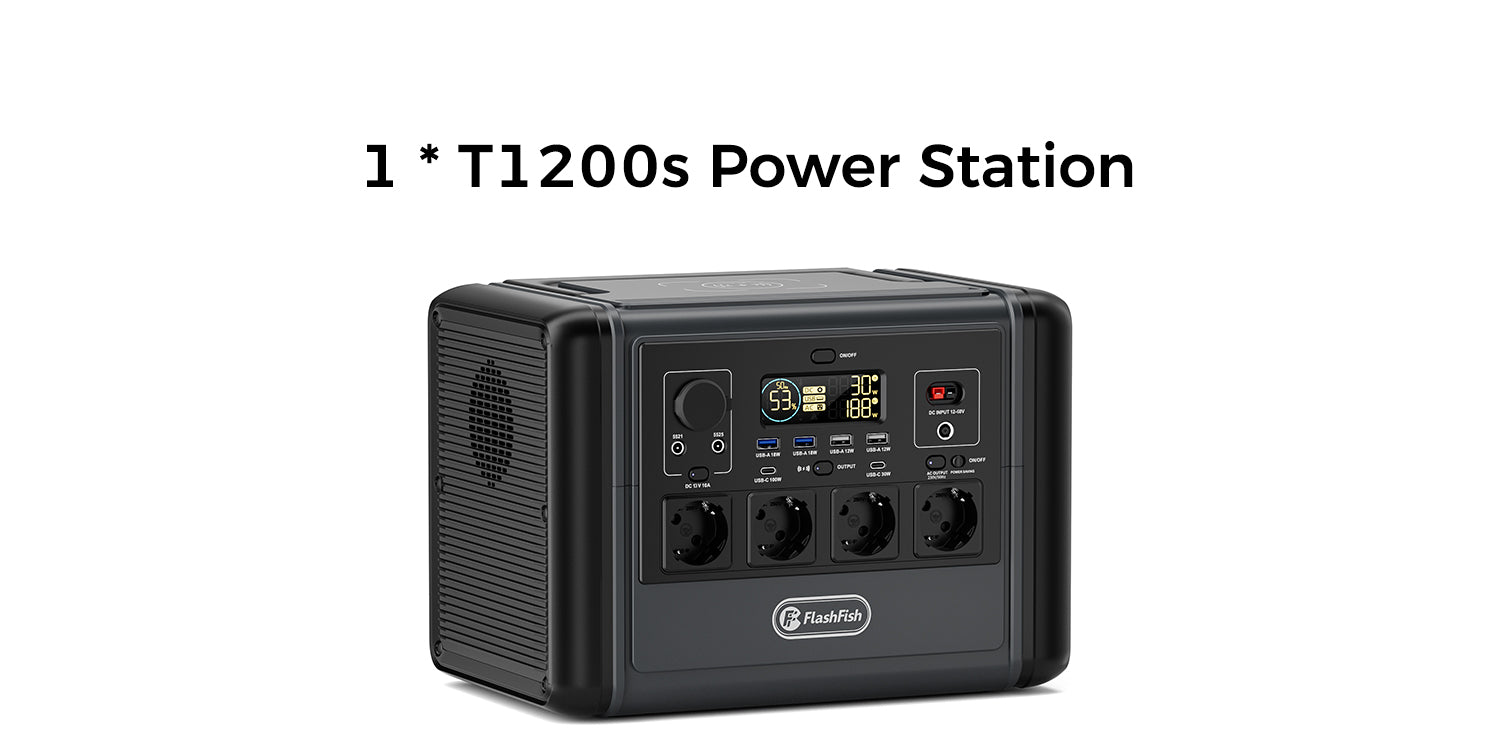 The FlashFish T1200S 1200W Portable Power Station is a high-performance unit featuring a Lithium Iron Phosphate (LiFePO4) battery. Engineered for extended, continuous power delivery, it is capable of simultaneously meeting the energy demands of a wide range of common electronic devices and high-wattage appliances.