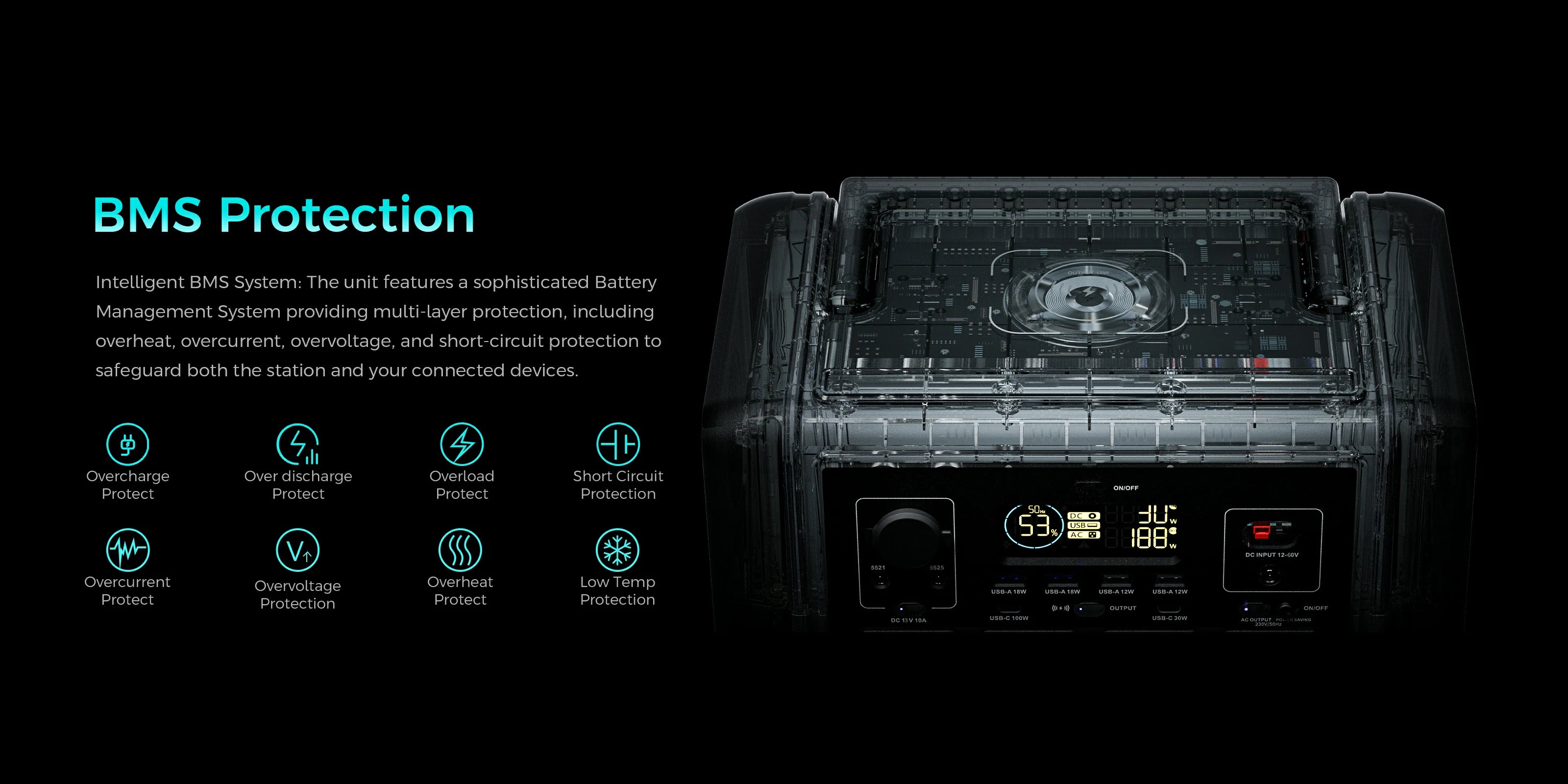 ●A: As long as the total power does not exceed the 1200W rated capacity, you can simultaneously power tools like electric saws, microwave ovens, and laptops through its 10 output ports.